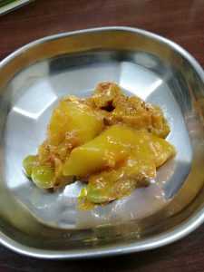 ネパール産ビール「ネパールアイス 650円」を頼むとお通しで「冬瓜のスパイス煮」みたいなものが出されました。これが絶妙に美味しくて驚きです。