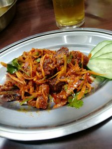 ただのラム肉ではなく、干された肉を調理しているので、歯応えがあり、噛むほどに羊肉の味が染み出してきます。スパイスもしっかり効いており、鼻孔が幸せになります。絶品の美味しさ。