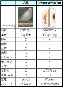 今回が初の投稿というわけではなく、2014年9月のiPhone6から文鳥との比較表を作成しているとのことなので、
