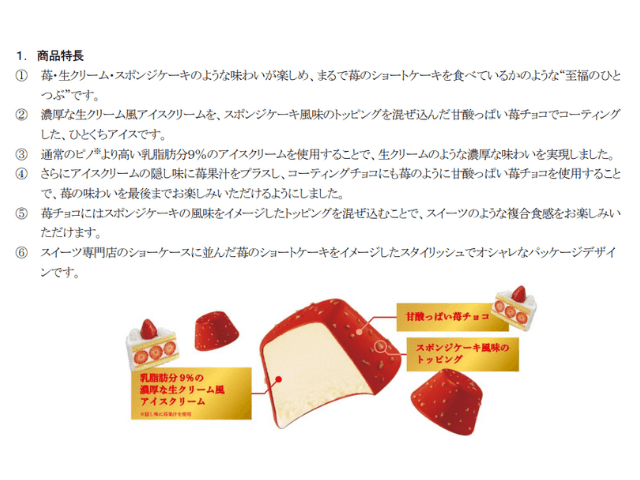 『ピノ苺のショートケーキ』は苺・生クリーム・スポンジケーキを一緒に食べた時の味わいを目指したひとくちタイプのアイス。
