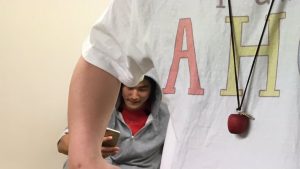 モーリーさんは着ていたTシャツをアピールしたかったようですが、なんとその後ろには見慣れたグレーの上下パーカーを着た人物が…